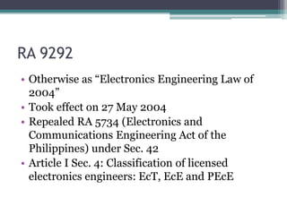 This document summarizes key provisions of RA 9292 or the Electronics Engineering Law of 2004 in the Philippines. It establishes a Professional Regulatory Board of Electronics Engineers to regulate the profession. Licensed electronics engineers are classified into three types and must pass a licensure exam covering subjects like math, engineering sciences, and electronics. Foreign professionals must ensure reciprocity by having at least two Filipino employees in their home country. A single accredited professional organization is also established.