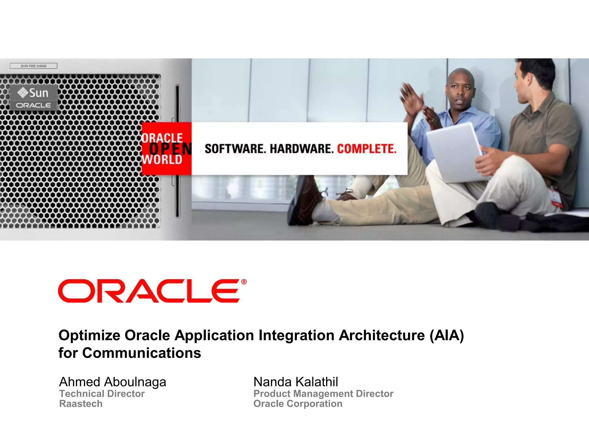 This document outlines a presentation on optimizing Oracle Application Integration Architecture (AIA) for communications. The presentation agenda includes an overview of Oracle AIA, Oracle AIA for communications, and three case studies on automating infrastructure installations, migrating to high availability, and automating code deployments. The presentation aims to demonstrate how Oracle AIA can help integrate communications applications and processes to deliver faster service and reduce costs.