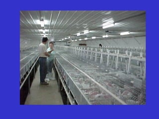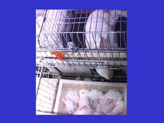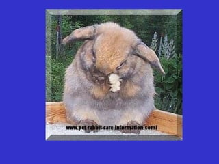 Rabbits come in 43 recognized breeds by the ARBA. Some common breeds include New Zealand Whites, used for meat production, Florida Whites which are smaller, and Himalayans which originated from mountain regions. Rabbits are also bred for fiber like Angoras or as pets like Lionheads. Domestic rabbits were first bred by French monasteries in the 1500s. Today China has over 500 million rabbits, mostly farmed for meat. Rabbits can be profitable to raise on small farms for their rapid reproduction rate and efficient feed conversion. Some challenges are lack of processing infrastructure and that they are seen as cute pets by some.