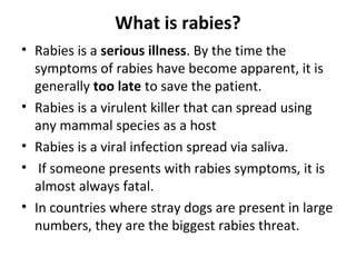 Rabies is a fatal viral infection spread through the saliva of infected mammals, most commonly dogs. The virus causes neurological symptoms including anxiety, confusion, and fear of water. While initial symptoms may resemble the flu, the infection worsens and can lead to paralysis, hyperventilation, and death. Transmission occurs through bites or contact between saliva and open wounds or mucous membranes. Once symptoms appear, rabies is almost always fatal.