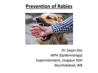 This document provides information on the prevention of rabies. It discusses that rabies is a fatal viral infection spread through animal bites, but is completely preventable. It describes pre-exposure and post-exposure prophylaxis vaccination protocols. For post-exposure, it outlines wound management and categories of exposure that determine vaccination and possible immunoglobulin treatment. Modern rabies vaccines and immunoglobulins are effective and safe. The goal is to eliminate human rabies deaths in India by improving access to prophylaxis and controlling stray animal populations.