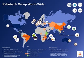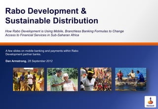 Rabo Development is using mobile and branchless banking models to expand access to financial services in sub-Saharan Africa. They have launched several successful mobile banking programs through their partner banks in countries like Zambia, Malawi, Tanzania, and Rwanda. These programs allow customers to access services like balance checks, money transfers, bill payments, and prepaid services directly from their mobile phones without needing to visit a traditional bank branch. For example, in Rwanda, Rabo Development helped automate all 191 branches of the largest bank, BPR, and launch a mobile banking program that now has over 150,000 customers.