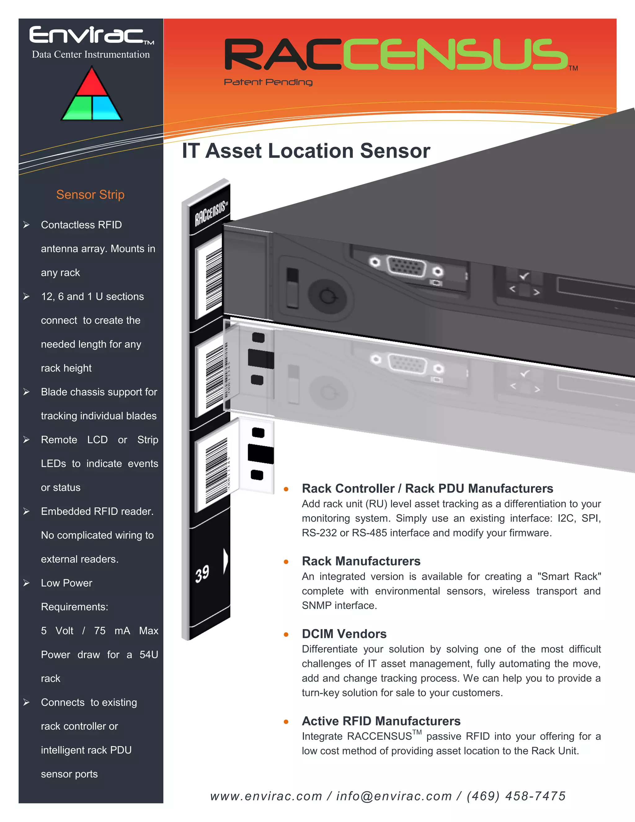 The document describes Envirac's RACCENSUSTM IT asset tracking system. It consists of (1) a contactless RFID antenna array called a sensor strip that mounts in server racks to track assets at the rack unit level with low power requirements, (2) IT asset tags that attach to assets with passive RFID, and (3) options for manufacturers and DCIM vendors to integrate the system or license the technology. The system automatically tracks asset moves, additions, changes and disposals in real time.