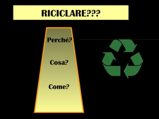 Il documento discute l'importanza del riciclo e della riduzione dei rifiuti, evidenziando che nel 2020 ci sarà un aumento significativo della produzione di rifiuti in Europa. Viene esaminato il riciclo di vari materiali come metalli, legno, carta, plastica e vetro, fornendo statistiche e fatti sul loro impiego e sul risparmio di risorse. Infine, il documento sottolinea l'importanza della separazione corretta dei materiali e del ridotto impatto ambientale del riciclo.