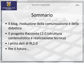 Il progetto 'racconto l2.0' si concentra sulla produzione scritta online attraverso l'uso di blog, migliorando l'insegnamento e l'apprendimento delle lingue. I risultati preliminari mostrano che gli studenti hanno trovato l'attività utile e divertente, con un notevole miglioramento delle abilità di scrittura e informatiche. È previsto un ulteriore sviluppo della piattaforma per migliorarne la funzionalità e l'interazione.