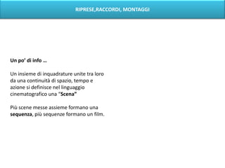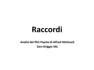Il documento analizza il film Psycho di Alfred Hitchcock, discutendo le tecniche di ripresa, raccordo e montaggio. Viene spiegato come le scene siano collegate attraverso vari tipi di raccordi e dissolvenze, che contribuiscono alla continuità narrativa. Sono esemplificati diversi raccordi, come raccordi di movimento e sguardo, attraverso situazioni specifiche presenti nel film.