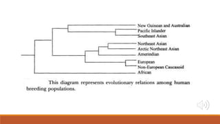 Robin Andreason argues that race has a biological foundation based on genetic similarities between human populations. She uses cladistic theory to classify races into phylogenetic groups like Africans, Caucasians, etc. However, the document summarizes that Andreasen's arguments are flawed since there is 90% genetic variation within populations rather than between them. It concludes that race is a social construct not determined by genes, but rather environment and culture, creating arbitrary divisions and hierarchies between groups.
