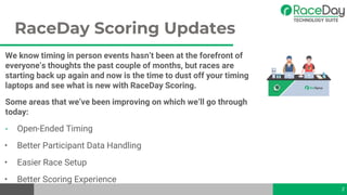 The document provides an overview and update on new features for RaceDay Scoring timing software. Key points include: