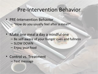Mindful eating through slowing down and paying attention to hunger and fullness cues can help avoid food comas according to a study that sent text messages with mindful eating tips to participants. The study found those who received the text tips reported higher average hunger but also more satisfaction after meals compared to a control group. Participants felt the text messages could help them maintain mindful eating habits long-term.
