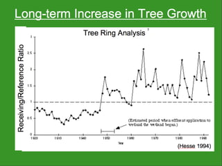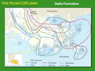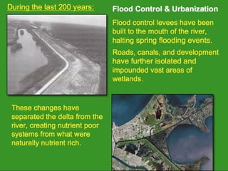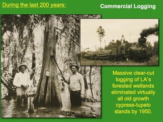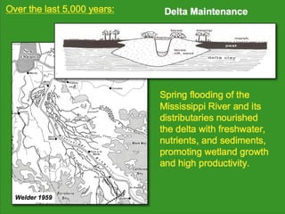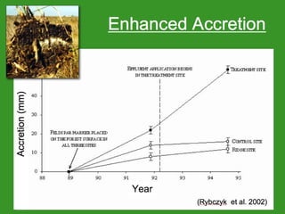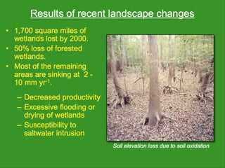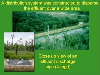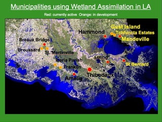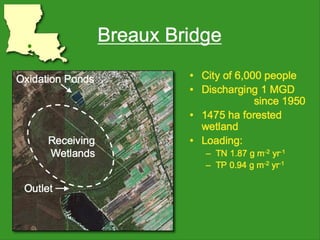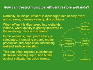The document discusses using wetlands to treat municipal wastewater effluent in Louisiana. It outlines criteria for using wetlands for effluent assimilation, including treating and disinfecting effluent with no toxic inputs and appropriate sizing of wetlands. It also describes monitoring various aspects of the receiving wetlands' water quality, vegetation, soils, and benthos to evaluate the ecosystem response. The conclusions state that wetland assimilation of treated municipal effluent is effective for both wetland restoration and improving water quality by increasing vegetation, organic matter deposition, and surface elevation.