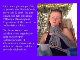 Rachel Corrie, giovane pacifista di 23 anni, è morta mentre cercava di fermare la distruzione delle case palestinesi a Gaza. Nonostante il suo impegno pacifico, è stata schiacciata da un bulldozer israeliano, diventando simbolo del movimento per la giustizia in Palestina. Il documento sottolinea l'importanza di ricordare il suo sacrificio e la necessità di continuare a lottare per una soluzione pacifica al conflitto israelo-palestinese.