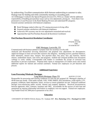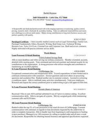 Rachel Reynoso has over 15 years of experience in loan processing, underwriting, and quality control. She has worked for several large financial institutions including USAA, CitiMortgage, Bank of America, and EMC Mortgage. She has a proven track record of exceeding goals and metrics. Reynoso received her Paralegal Certificate in 2015 and B.S. in Marketing from the University of North Texas in 2007.
