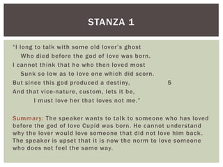 The poem analyzes the concept of love through four stanzas. The speaker wants to discuss love with someone from a time before Cupid, as he cannot understand pursuing someone who does not love you back. Each stanza presents a different perspective on love: mutual love represented by Cupid, a distorted modern view of love, and admitting that loving someone unattainable can still be true love. Imagery of mythology is used to discuss the changing definition of love.