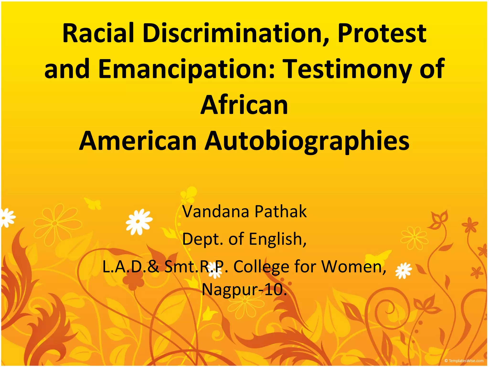 The document discusses the significance of African American autobiographies as a means of expressing the struggles against racial discrimination and seeking emancipation. It categorizes black autobiographies into three periods and highlights key themes, like racial consciousness and protest literature, that reflect the oppressive conditions faced by black individuals. Notable figures mentioned include Frederick Douglass, W.E.B. Du Bois, and Richard Wright, emphasizing how their narratives served as instruments for social change and collective identity.