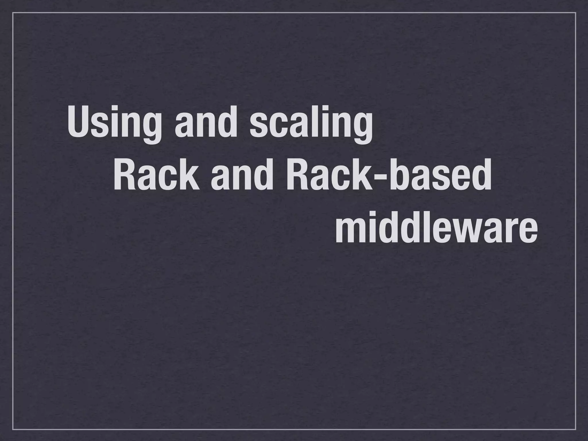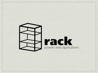 Rack provides a standard interface between web servers and web applications. It allows a web application to return a status, headers, and a body in response to an HTTP request. Middleware can be plugged into a Rack application to modify requests and responses. Popular Rack middleware includes Rack::Cache, Rack::Middleware, and Warden for authentication. In Rails, middleware is configured through an initializer and plugged into the middleware stack to run before or after other middleware.
