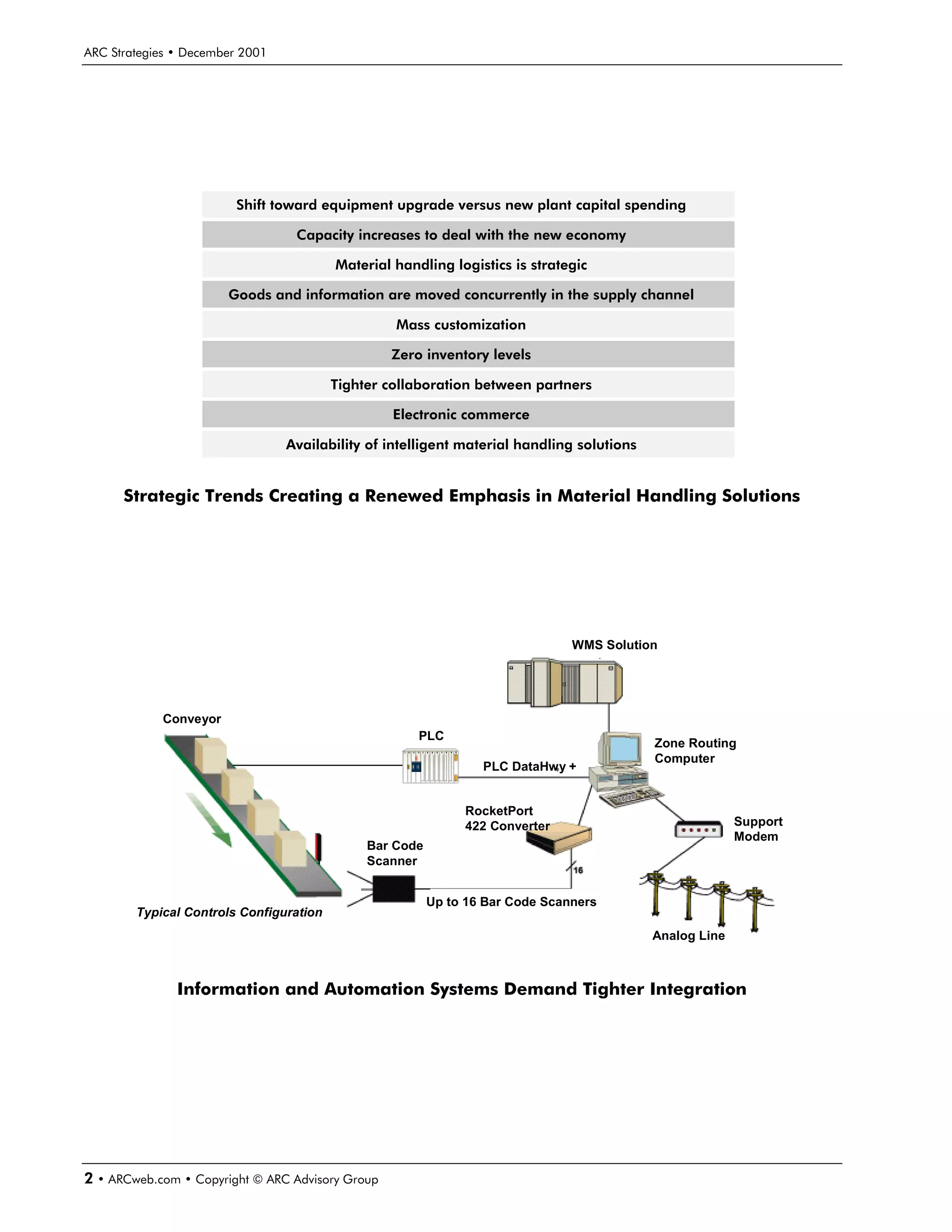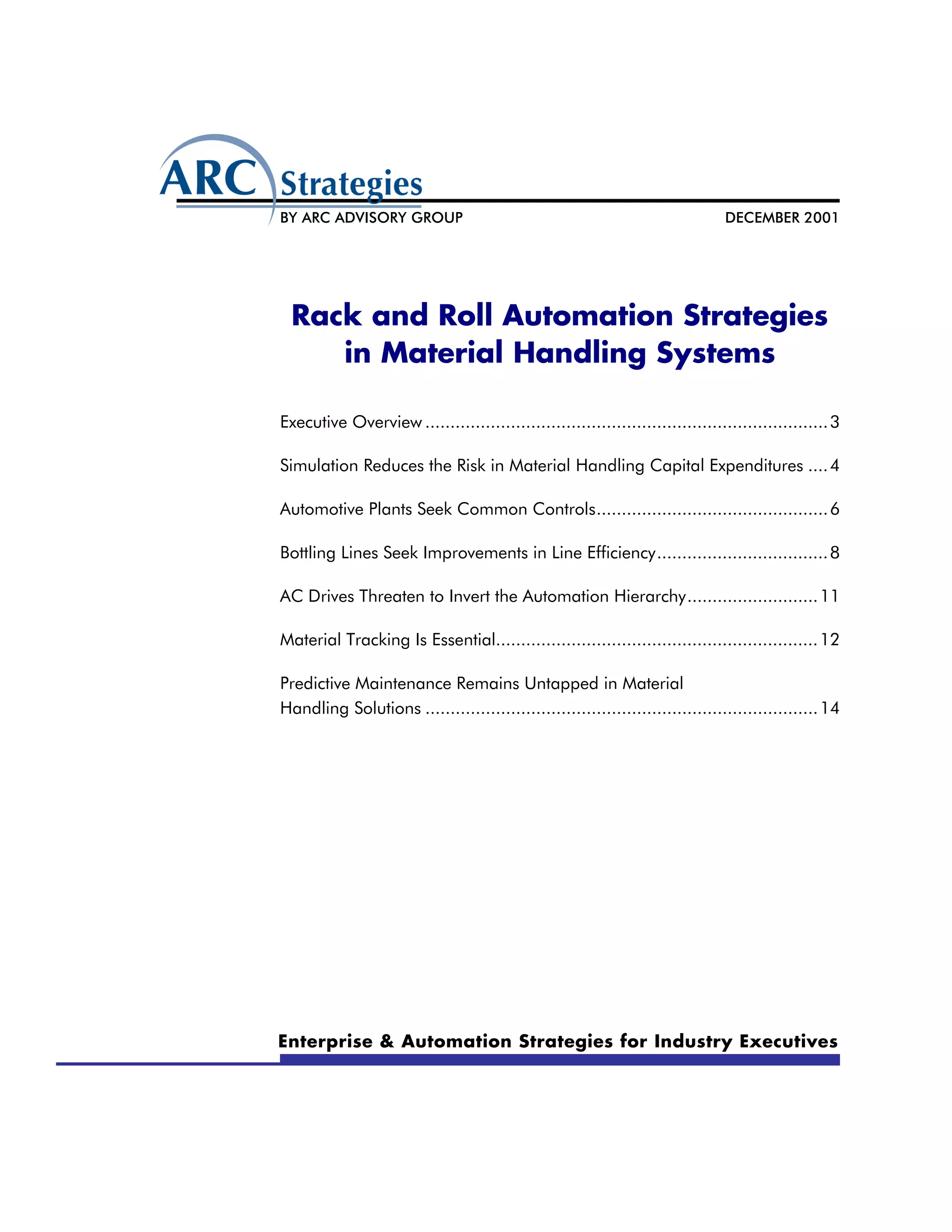 The document discusses material handling strategies in various industries. It notes that simulation software is now commonly used to reduce risks when planning large capital expenditures on material handling systems. In the automotive industry, plants are moving toward more flexible and reconfigurable production lines using common control systems for both machine tools and overhead material handling equipment. The bottling industry seeks to improve line efficiencies through better synchronization of conveyor speeds using variable speed drives and smart conveyors, but has been slow to adopt these technologies for retrofitting existing lines.