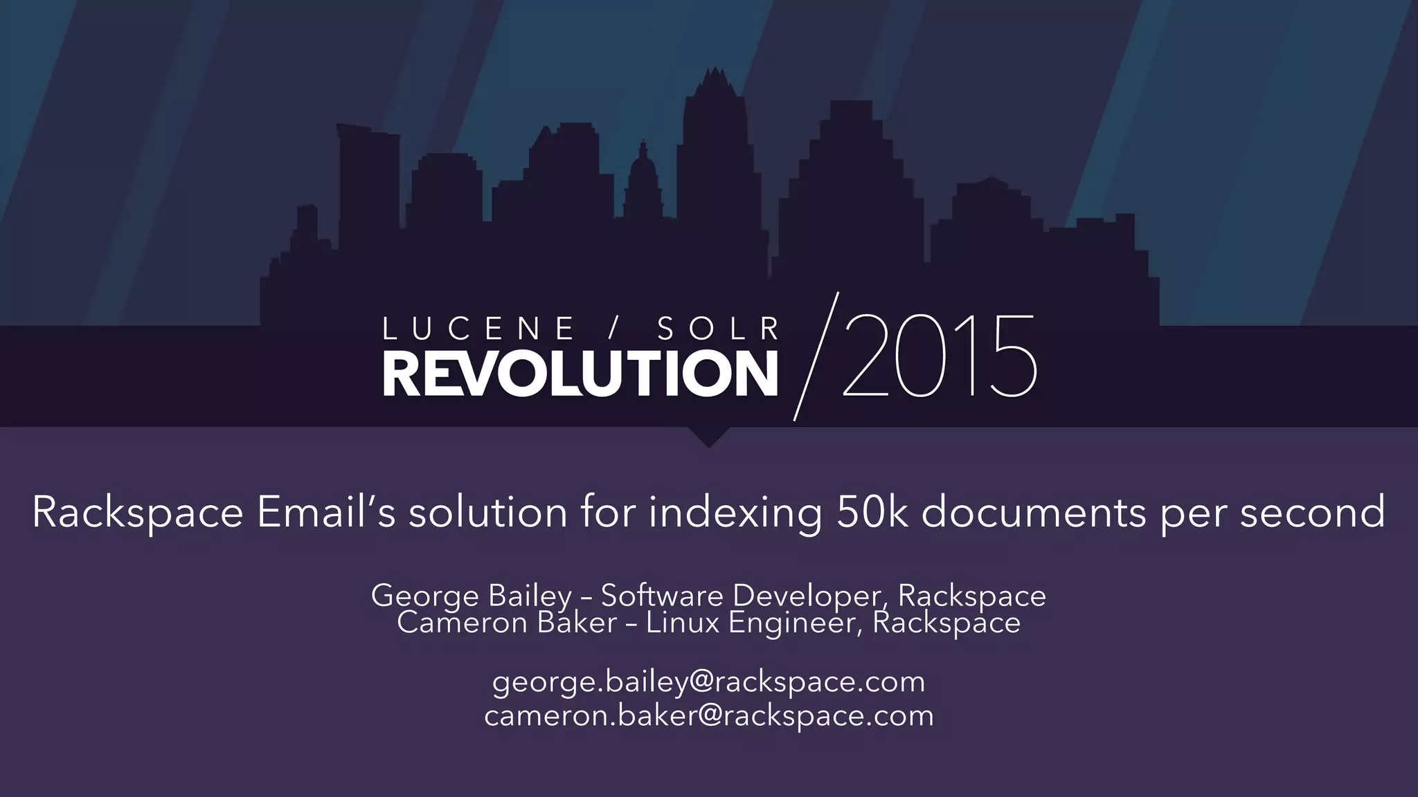 George Bailey and Cameron Baker of Rackspace presented their solution for indexing over 50,000 documents per second for Rackspace Email. They modernized their system using Apache Flume for event processing and aggregation and SolrCloud for real-time search. This reduced indexing time from over 20 minutes to under 5 seconds, reduced the number of physical servers needed from over 100 to 14, and increased indexing throughput from 1,000 to over 50,000 documents per second while supporting over 13 billion searchable documents.