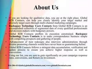 Global B2B Contacts LLC offers a comprehensive database of targeted mailing lists, focusing on decision-makers and professionals across various industries. Their services ensure high response and conversion rates for marketing campaigns, utilizing accurate and authoritative data sources. They provide a free consultation and sample before purchasing, guaranteeing a reliable delivery of information with a focus on enhancing business communications.