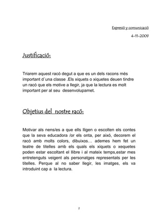 Expresió i comunicació <br />4-11-2009<br />Racó <br />de la biblioteca<br /> <br /> Marta Fayos Sáez <br />Susana Zamora Arévalo<br />Concordia Martínez Beltrán<br />Ángela Gómez Alemany<br />Pedro J. Cubells Ros<br /> <br />Expresió y comunicació <br />4-11-2009 <br />Justificació:<br />Triarem aquest racó degut a que es un dels racons més important d´una classe .Els xiquets o xiquetes deuen tindre un racó que els motive a llegir, ja que la lectura es molt important per al seu desenvolupamet.<br />Objetius del nostre racó:<br />Motivar als nens/es a que ells lligen o escolten els contes que la seva educadora /or els onta, per aixó, decorem el racó amb molts colors, dibuixos… ademes hem fet un teatre de titelles amb els quals els xiquets o xequetes poden estar escoltant el llibre i al mateix temps,estar mes entretenguts veigent als personatges representats per les titelles. Perque al no saber llegir, les imatges, els va introduint cap a la lectura.<br />Expresió y comunicació <br />4-11-2009 <br />Materials:<br />Llibres