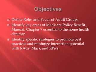 This document discusses strategies for home health care agencies to minimize risks from audits. It outlines the various entities that conduct audits, including RACs, MACs, and ZPICs. Key areas that auditors focus on include medical necessity, coding accuracy, documentation quality, and compliance with Medicare policies. The document provides guidance on ensuring documentation clearly supports the patient's homebound status, medical necessity of skilled services, and demonstrates progress towards goals. It emphasizes having objective data to justify findings and treatment plans.