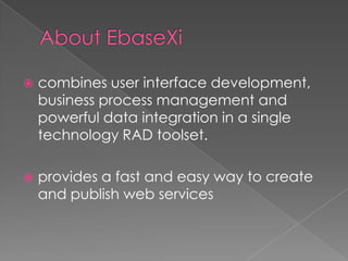 This document describes how to create a mashup using the RAD toolset to combine two existing web services. The mashup will take plain text as input, identify the language, and if it is English or Romanian, will pass the text to a text processing service to output processed text with part-of-speech tags and other details. It provides details on the existing Racai web services to be used, the steps to import them as entities in RAD, create a business view and integration service to combine them, and generate a new web service mashup.