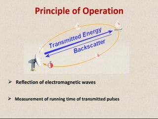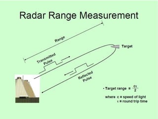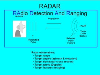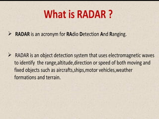 RADAR (Radio Detection and Ranging) is a system used to detect distant objects by transmitting radio waves and detecting the radio waves that bounce back. The key components of a RADAR system include a transmitter, receiver, antenna, display, and power supply. RADAR uses the Doppler effect to measure how fast targets are moving by detecting changes in the frequency of reflected radio waves. Applications of RADAR include weather forecasting, air traffic control, search and rescue operations, and mapping.
