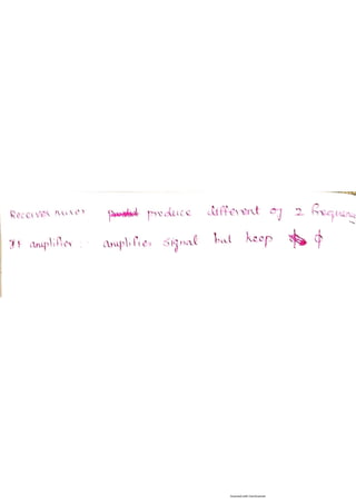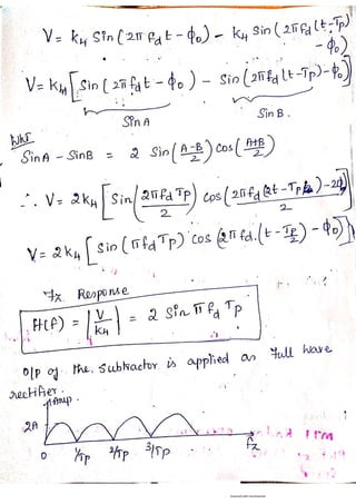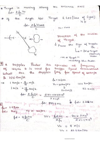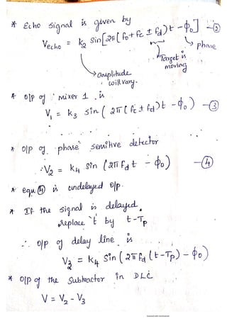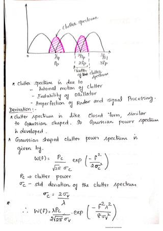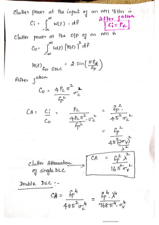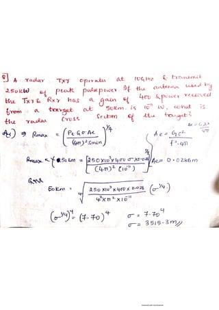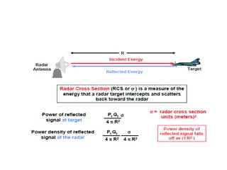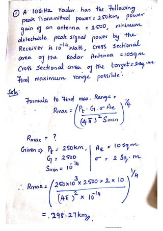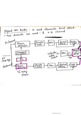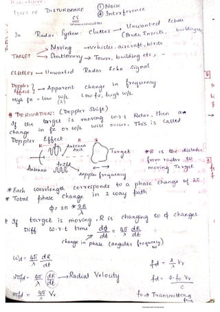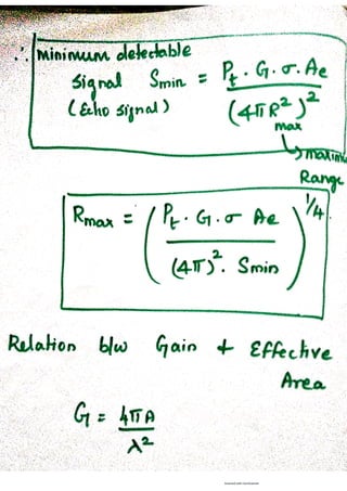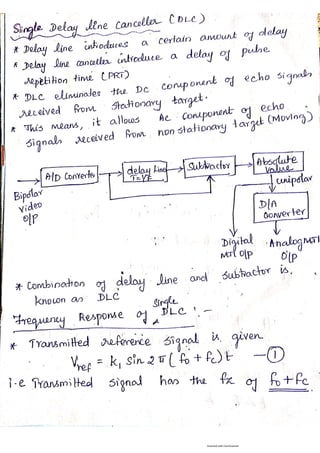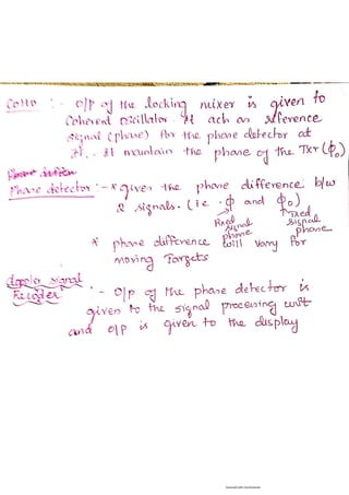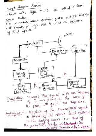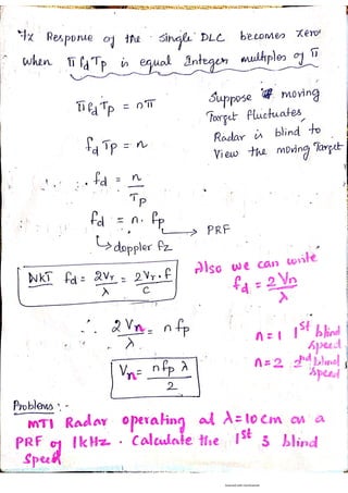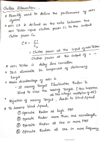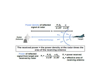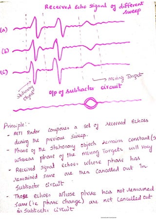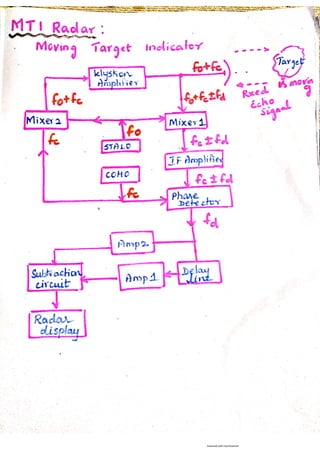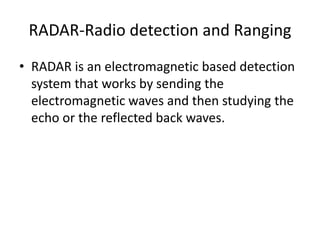 RADAR is an electromagnetic detection system that works by transmitting electromagnetic waves and studying the echo or reflected back waves. It has applications in air traffic control, ship safety, military uses, and more. The maximum unambiguous range of a radar is determined by its pulse repetition frequency, beyond which targets will cause ambiguous echoes. MTI radar uses doppler filtering and pulse cancellation to remove stationary clutter and detect moving targets. Limitations include equipment instability, internal clutter fluctuations, and finite time observing targets while scanning. Noncoherent MTI detects moving targets using amplitude fluctuations rather than phase fluctuations as in coherent MTI radar.