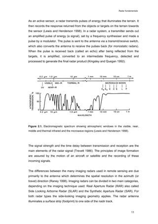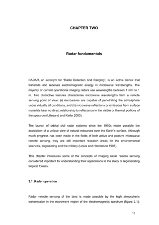 Radar fundamentals introduces key concepts of radar remote sensing. Radar transmits and receives microwave signals to image the Earth's surface. There are two main types of radar systems - Real Aperture Radar (RAR) and Synthetic Aperture Radar (SAR). SAR uses antenna movement to synthesize a larger antenna and achieve higher resolution. Radar backscatter is influenced by system parameters like wavelength, polarization, and incident angle as well as target characteristics such as surface roughness and electrical properties. SAR images provide unique views of the Earth's surface and are important tools for environmental and military applications.