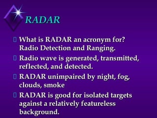 This document describes the design and fabrication of a dual ultrasound-based pulse wave radar system with 360-degree vision. Key components include an Arduino Uno microcontroller, two HC-SR04 ultrasonic sensors, an SG-90 servo motor, and a Processing software interface. The system was designed to rotate the ultrasonic sensors using the servo motor to enable 360-degree distance measurement. Programming was done to control the sensors, motor and process sensor data for visual output on the Processing interface. The total cost of components for fabricating the prototype radar system was approximately 2680 Indian rupees.