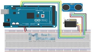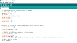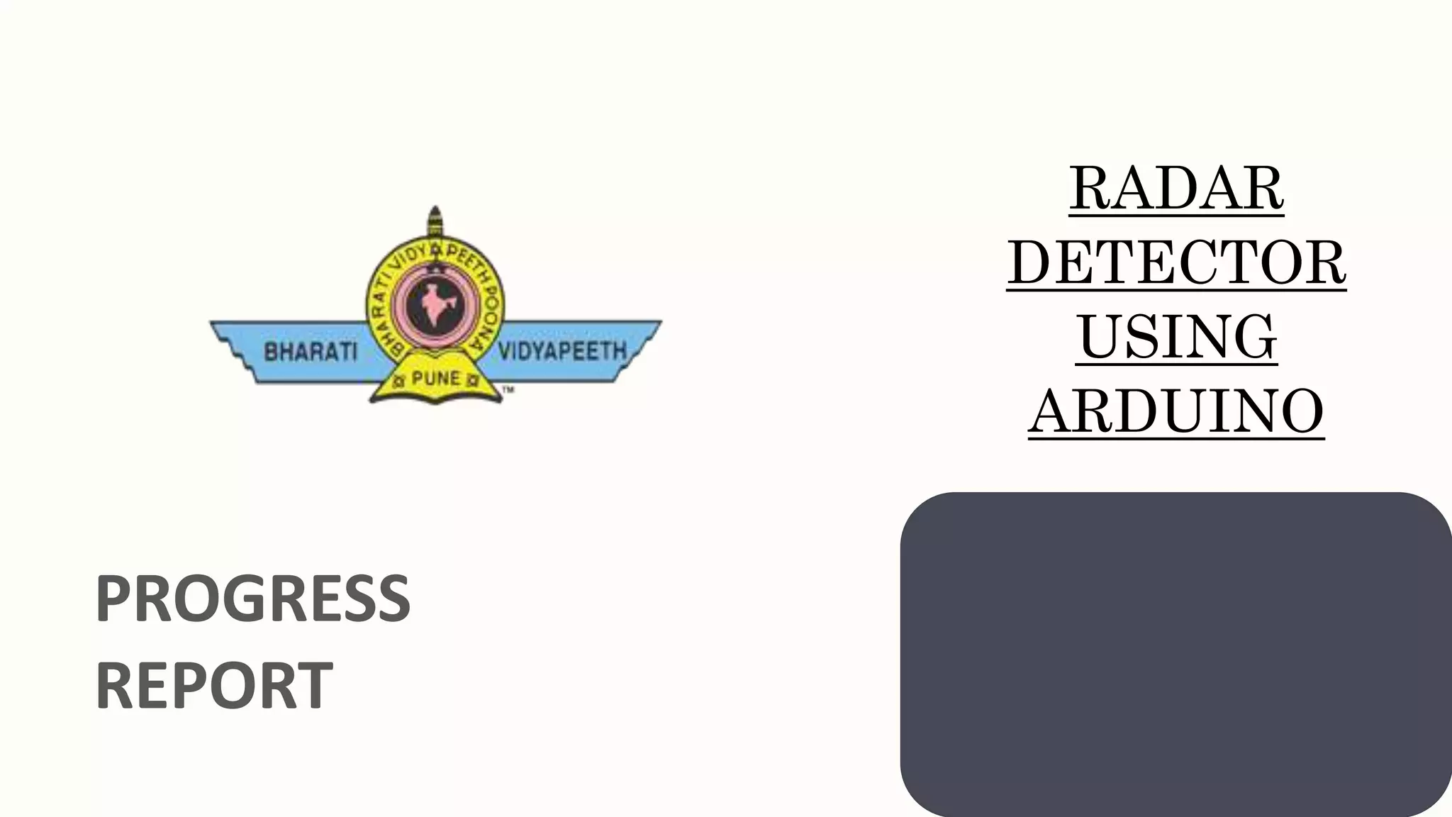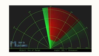 This document provides a progress report on developing a radar detector using Arduino. The goal is to create a rangefinder device that can measure distance from 3cm to 40cm using an ultrasonic sensor controlled by a servo motor. The theoretical approach, hardware used, software used, circuit diagram, code for Arduino and Processing 3, and current progress are described. The device is able to detect distance and the angle of detection is planned to be increased by adding a second ultrasonic sensor. Future additions may include connecting to a smartphone via Bluetooth and developing a mobile app.