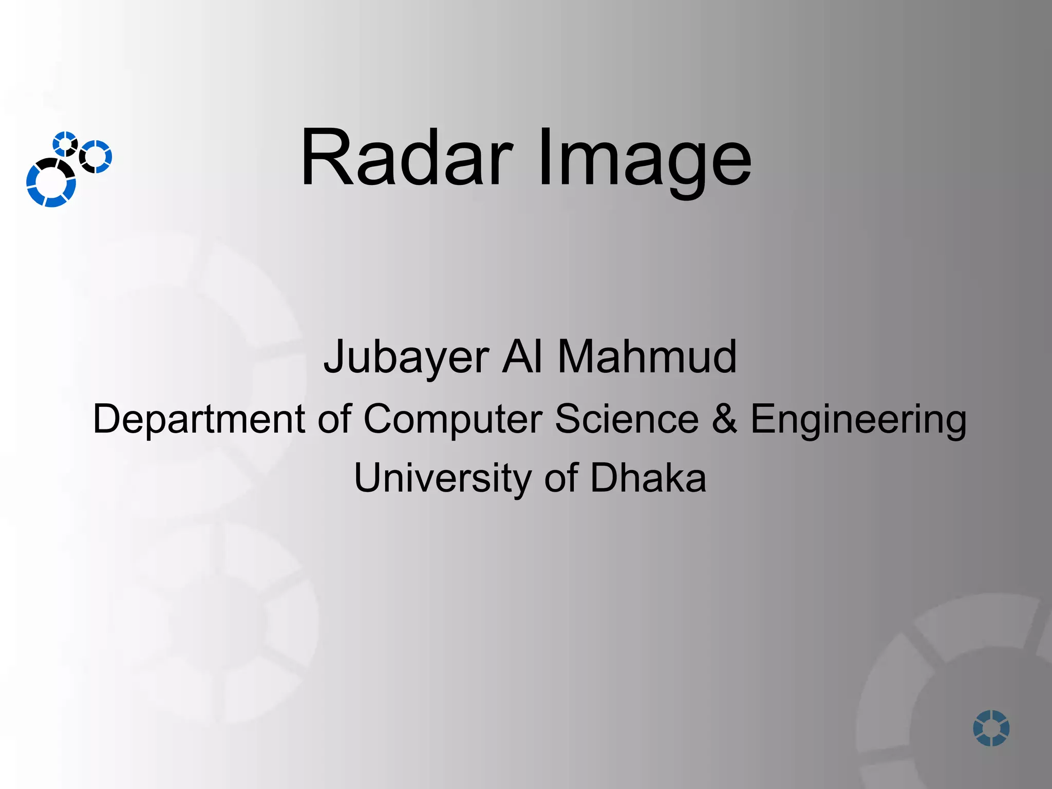 This document discusses radar images and their properties. It defines radar as a system that detects objects using electromagnetic waves, and a radar image as a two-dimensional image produced by a radar system. Each pixel in a radar image represents radar backscatter from an area on the ground, with brighter pixels indicating higher backscatter. The document describes how radar images are formed using devices like real aperture radar and synthetic aperture radar. It also discusses how averaging and frost filters can be applied to radar images to reduce noise. Finally, it provides examples of applications of radar images such as surface topography mapping, weather monitoring, and environmental monitoring.