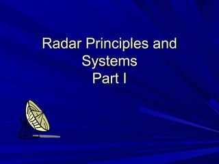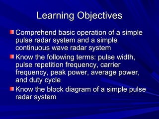 This document provides an overview of two basic radar types: pulse transmission radar and continuous wave radar. It describes the key components and operating principles of each. Pulse radar relies on pulse width and repetition frequency to determine range, while continuous wave radar uses the Doppler effect of the frequency shift in returned echoes to deduce information about targets. The document also discusses radar modulation techniques, antenna design and beamforming, and other major components like transmitters, receivers, and waveguides.