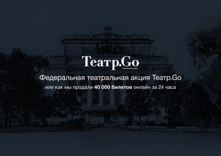 Документ описывает успешную федеральную театральную акцию театр.go, в ходе которой было продано 40 000 билетов онлайн за 24 часа. Участие приняли 61 театр из 14 городов, и акция была поддержана активной рекламной кампанией через e-mail-маркетинг и социальные сети. Основная цель заключалась в популяризации онлайн-продажи театральных билетов с значительными скидками от 25% до 90%.