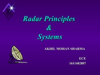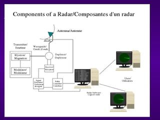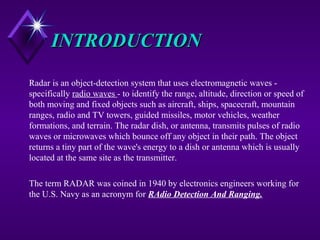 Radar uses radio waves to detect objects and determine their range, altitude, direction or speed. It works by transmitting pulses of radio waves which bounce off objects and return a portion of energy to the receiving antenna. Radar was developed in the 1930s-1940s and has two main types - pulse radar which uses pulse transmission and continuous wave radar which uses continuous transmission. Key components of radar systems include the transmitter, antenna, receiver and display. Factors like signal reception, bandwidth, power and beam width affect radar performance.