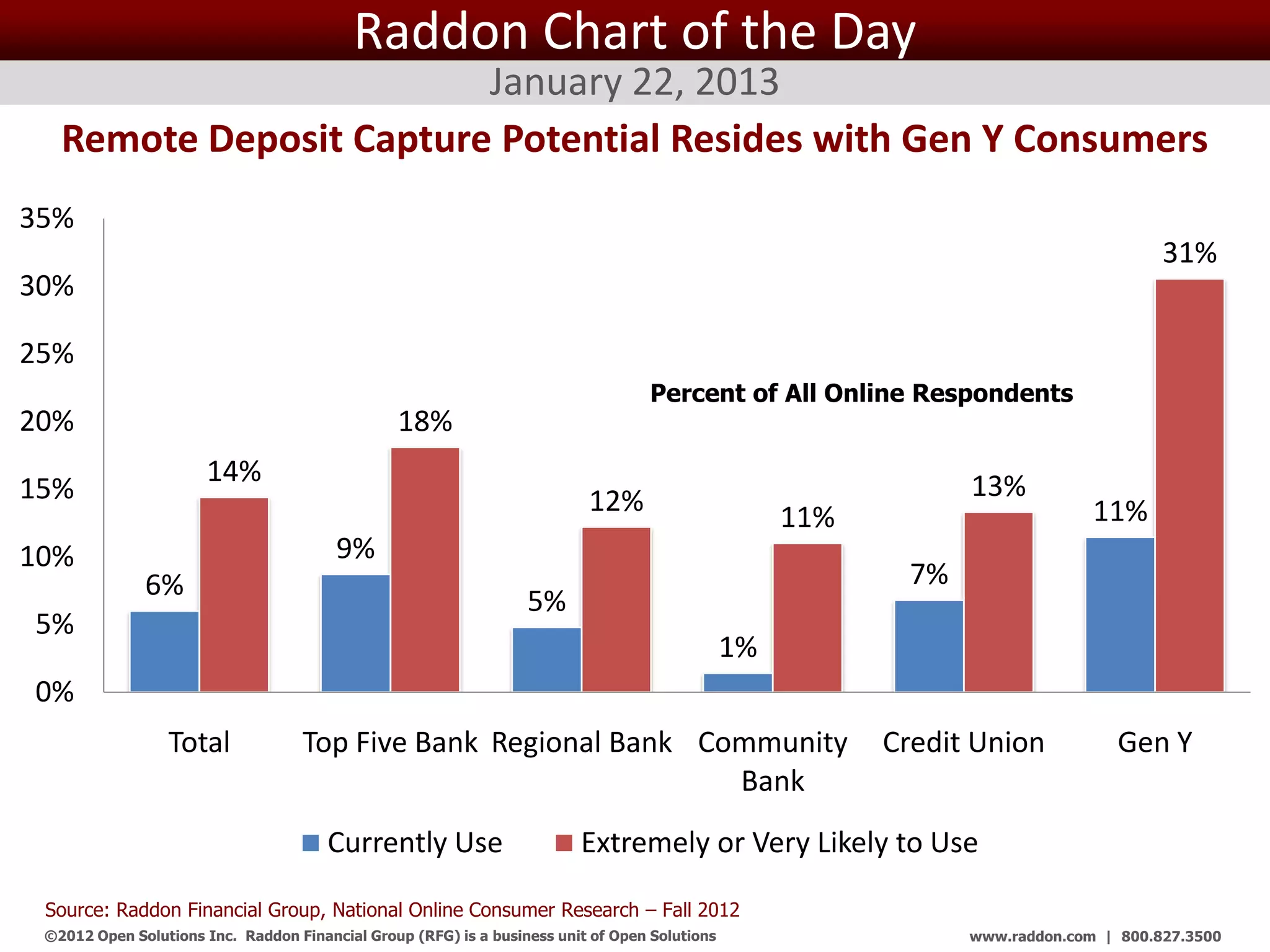 1) 35% of Gen Y consumers are likely to use remote deposit capture, more than other age groups.