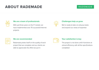 Rademade is a team of professionals that has implemented over 70 successful internet projects in their three years of operation. They provide services such as trading platforms, mobile apps, social networks, and more. Rademade prides itself on delivering high quality projects and ensuring client satisfaction. They have experience developing projects for companies in various industries including restaurants, online retail, and learning portals. Rademade is ready to bring clients' ideas to life, from complex web services to mobile applications.