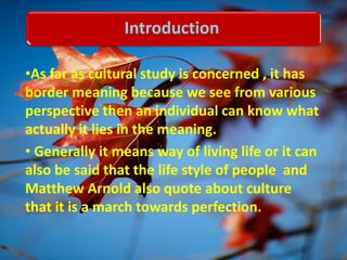 Cultural studies is an interdisciplinary field focused on understanding modern society through the lens of culture, power, and politics. It encompasses various approaches such as British cultural materialism, new historicism, American multiculturalism, postmodernism, and postcolonial studies, emphasizing the analysis of both cultural works and the means of their production. The goals of cultural studies include transcending disciplinary boundaries, engaging politically, challenging the separation of high and low culture, and addressing social inequalities.