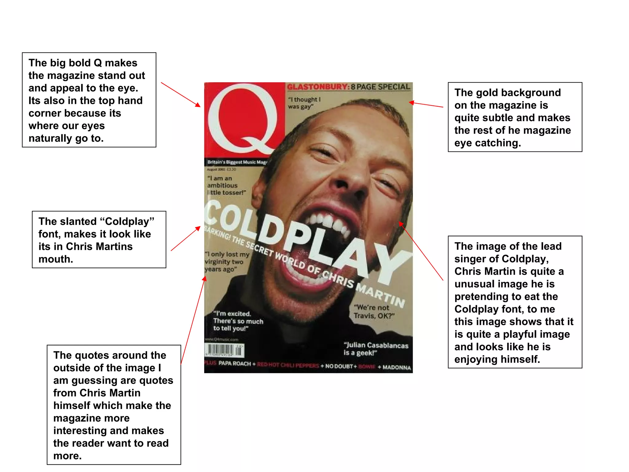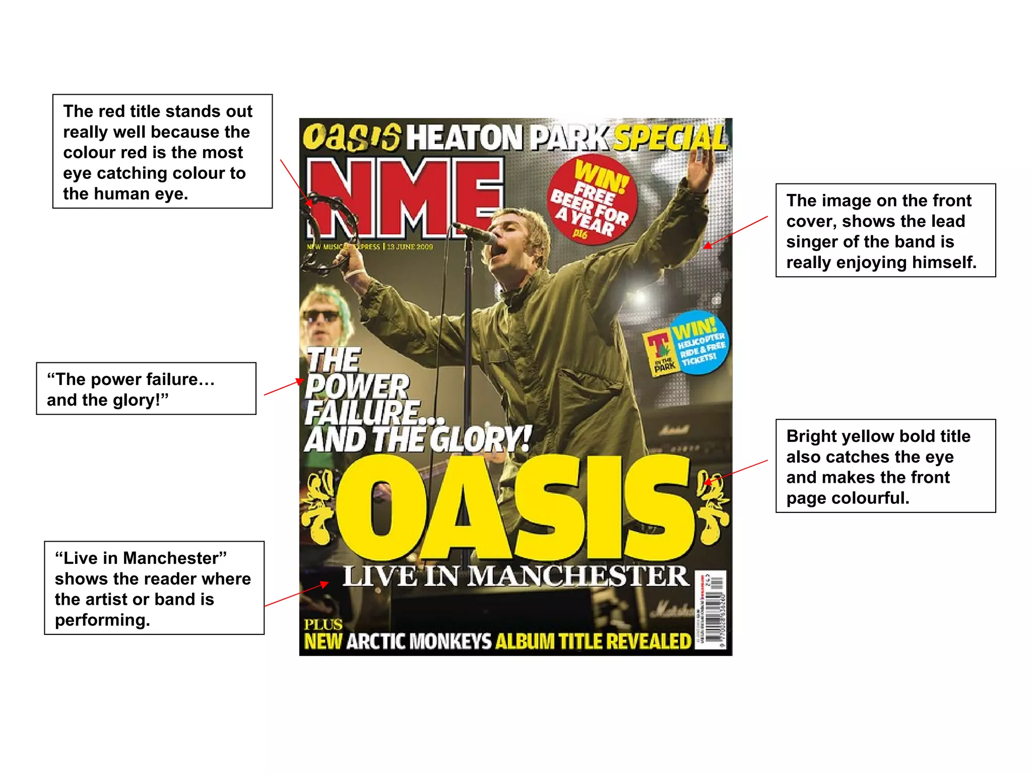 This document summarizes and analyzes the layout, design elements, and effectiveness of two music magazine double page spreads. For NME, it notes the bold colorful titles and image that stand out and make it eye-catching. For Q, it comments on the bold titles and image but judges the NME spread more effective overall. Both spreads are deemed good for their music genre.