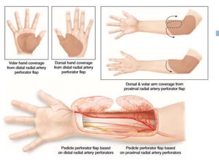 The radial forearm flap is based on the radial artery and its venae comitantes. It can be harvested as a fasciocutaneous or osteocutaneous flap with a long vascular pedicle. The radial forearm flap is commonly used in reconstructive surgery due to its reliable vascular anatomy, long pedicle length allowing for versatile positioning, and ability to provide a hairless skin match. Potential donor site complications include functional impairment and need for skin grafting or local flaps.