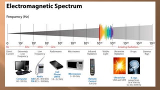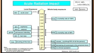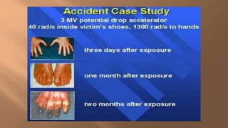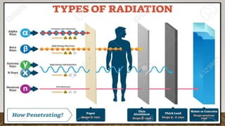 This document discusses ionizing and non-ionizing radiation. It defines ionizing radiation as radiation capable of producing ions through direct or indirect interaction with matter, while non-ionizing radiation does not have a wavelength sufficient for ionization. The document discusses the different types of ionizing radiation including electromagnetic radiation like x-rays and gamma rays, and corpuscular radiation like alpha particles, beta particles, neutrons, and protons. It also discusses the mechanisms of radiation damage, relative biological damage of different types of radiation, sources of background radiation exposure, and medical uses and effects of ionizing radiation.