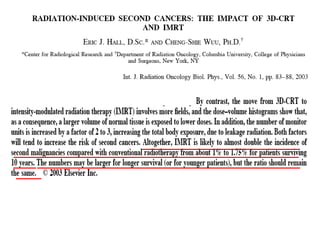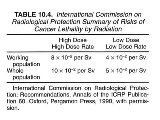 Radiation can cause both deterministic and stochastic effects. Deterministic effects have a threshold dose and increase in severity with higher doses, while stochastic effects like cancer have no threshold and risk increases with any dose but severity is independent of dose. Studies of radiation exposures from radium dial painters, atomic bomb survivors, and medical treatments provide data showing radiation is a carcinogen and mutagen, and the risk of cancer increases linearly with dose without a threshold. The lifetime cancer risk from radiation is estimated to be 10% per sievert of exposure at high doses.