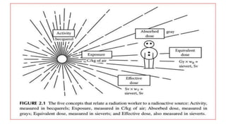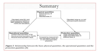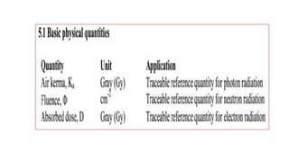 This document discusses various radiation quantities and units used in medical physics. It defines units like becquerel (Bq), gray (Gy), sievert (Sv), and rem (Roentgen equivalent man) used to measure activity, absorbed dose, equivalent dose, and effective dose. It also discusses concepts like half-life, decay constant, kerma, exposure, and dose conversion factors. International organizations like ICRP and ICRU provide recommendations on radiation quantities, units, and safety limits.