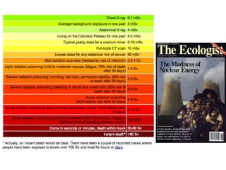 This document discusses the pros and cons of nuclear power. It notes that nuclear power has prevented millions of deaths from air pollution compared to fossil fuels, but nuclear waste remains radioactive for extremely long periods. High-level nuclear waste storage is an unresolved issue. Incidents like Chernobyl and Fukushima show the risks of nuclear accidents and their health impacts. While nuclear power avoids some pollution, proper long-term management of its radioactive waste remains a challenge.