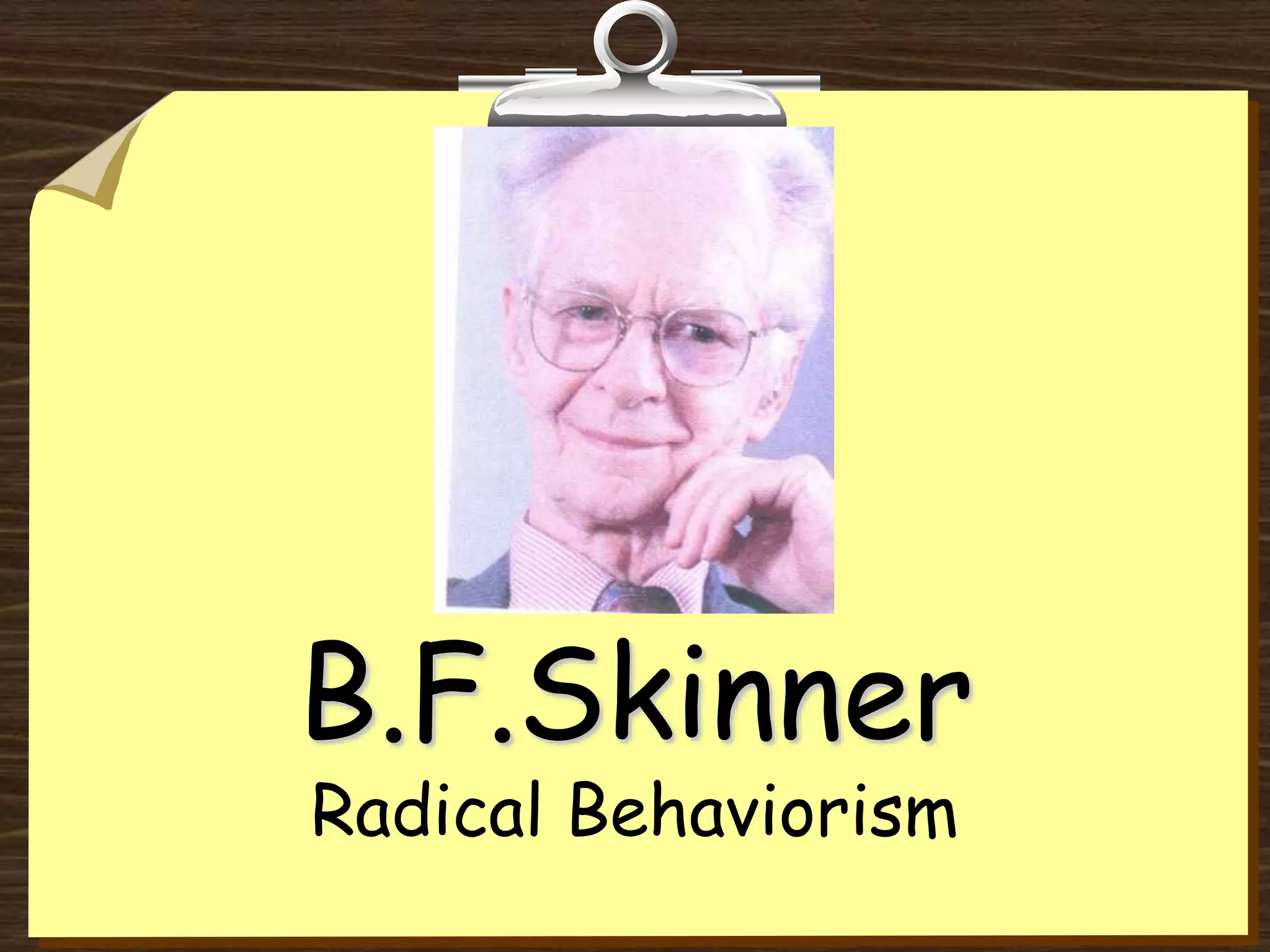 This document discusses B.F. Skinner's theory of radical behaviorism. It explains that behavior is shaped and maintained by its consequences, and outlines Skinner's model of the relationship between a discriminative stimulus, response, and reinforcement or punishment. It also discusses different types of reinforcement schedules and critiques both positive and negative aspects of applying Skinnerian principles to society, such as token economies and behavior modification techniques.