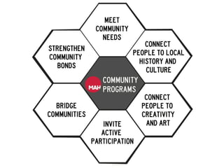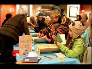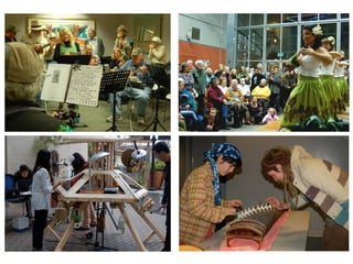 This document discusses tools and strategies for collaborating with community members, including putting partnership first, being clear about goals and transparent about process, being open to possibilities, recognizing five kinds of partners, and using workshops to identify community needs, assets, potential projects, and collaborators.
