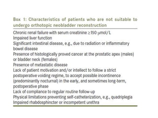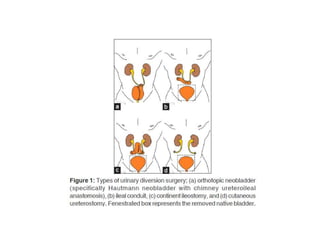 1) Radical cystectomy involves removal of the bladder and adjacent organs for muscle-invasive or high-risk non-muscle invasive bladder cancer.