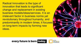 The document discusses radical innovation, highlighting its transformative impact on business models, as exemplified by blockchain technology and Apple's shift from iPod to iPhone. It contrasts radical innovation with disruptive innovation and emphasizes the need for a creative mindset to navigate such changes effectively. The MIT ID Innovation program offers courses to cultivate innovation skills, aiming to prepare future leaders in design and business.