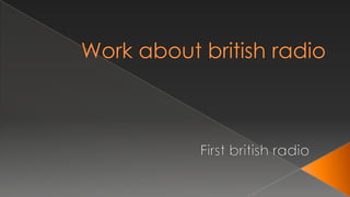 The document discusses the history of the first British radio. It states that in 1922, 2LO opened in May operated by Marconi, and the BBC began daily broadcasting on 2LO in November of that year. The BBC's National Programme replaced 2LO in 1930. The first voice on the radio was Arthur Burrows, who read the news.