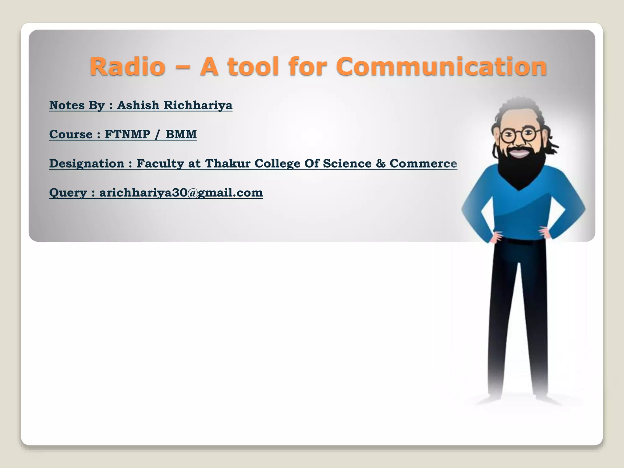 The document provides a comprehensive overview of radio as a communication tool, covering its definition, history, technology, and applications. Radio waves facilitate diverse communication systems, including broadcasting and navigation, and have evolved significantly since their invention by Guglielmo Marconi in the early 20th century. The term 'radio' derives from the Latin 'radius', and the technology has revolutionized mass media and personal communication.