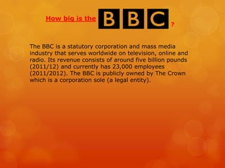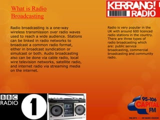 Radio broadcasting involves transmitting audio over radio waves to reach a wide audience. In the UK there are around 600 licensed radio stations, including public service stations run by the BBC, commercial stations funded through advertising, and community stations. The BBC is the largest public service broadcaster in the UK, operating national and regional radio stations across a variety of genres, as well as the BBC World Service which broadcasts internationally. Commercial radio stations primarily broadcast advertisements to generate revenue.